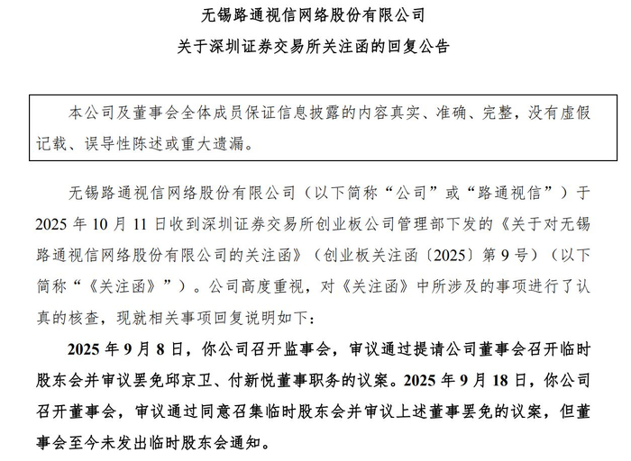 对此,深交所向ST路通下发关注函,要求其解释“临时股东会通知延迟”的原因等。