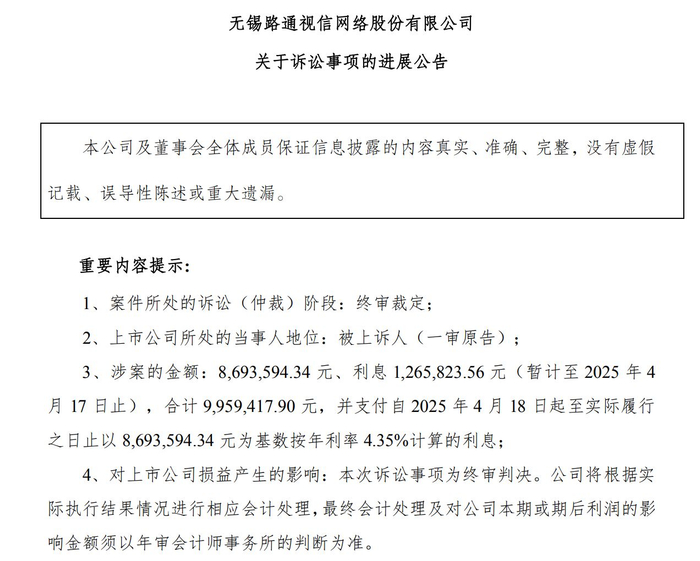 与关注函回复同日披露的还有ST路通资金占用诉讼的终审结果。云城人工智能撤回上诉,一审判决正式生效。