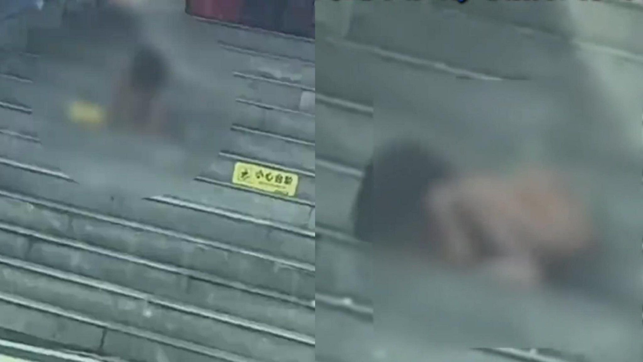 网友报料视频中显示,一个一丝不挂的孩子,趴在台阶上吃食物,身体黑黢黢的,头发乱糟糟的,旁边还有一位抱着小孩的大人好像正在与其说话。