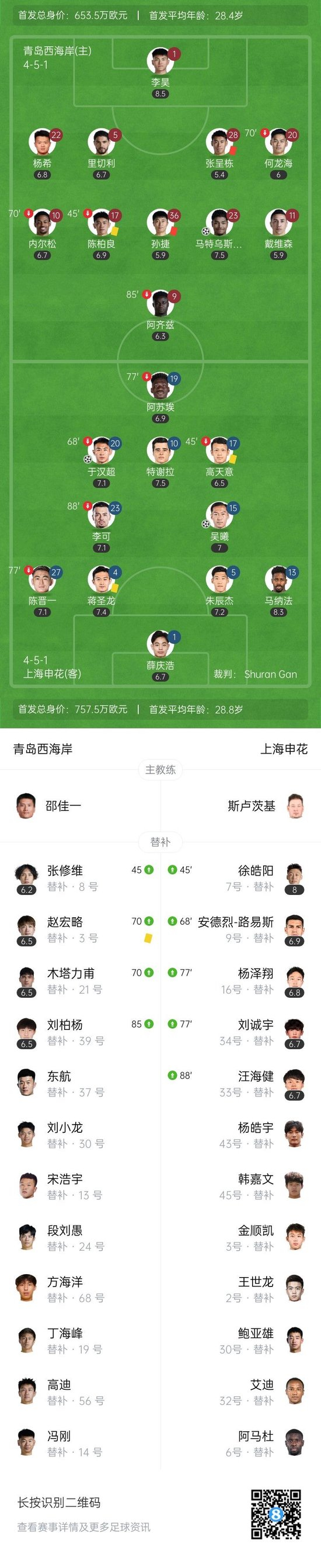 直播吧10月17日讯 北京时间20:00,中超第27轮青岛西海岸vs上海申花,比赛在青岛西海岸大学城体育场打响!上半场,阿齐兹单刀稍稍偏出;马特乌斯-因迪奥头球破门,马纳法造点,吴曦点射扳平!孙捷亮鞋钉踹倒于汉超,主裁回看VAR后改判直红!半场尾声阶段,张呈栋不满判罚,随后持续辱骂裁判,先是吃到黄牌随后被直红罚下!下半场,于汉超头球破门帮助申花反超比分!
