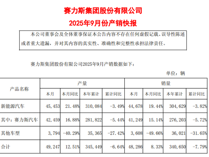官方数据显示,今年前9个月,赛力斯旗下新能源汽车累计销售约30.46万辆,其中赛力斯汽车累计销售约27.62万辆,贡献度超90%。